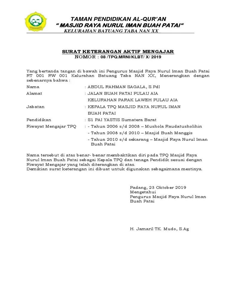 Surat keterangan aktif mengajar paud al . Banyak gunanya surat keterangan masih aktif mengajar ini, termasuk belum usang ini, bagi guru . Pemerintah kabupaten muna uptd pendidikan kecamatan katobu tk negeri pembina raha surat keterangan aktif mengajar nomor : Yang bertanda tangan di bawah ini kepala. Find out the newest pictures of contoh surat keterangan aktif mengajar dari yayasan here, and also you can have the picture here simply.