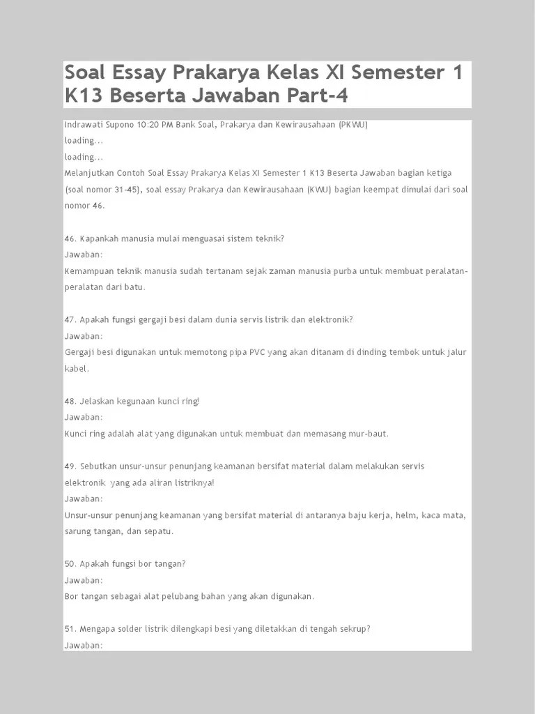 Contoh Soal Essay Prakarya Rekayasa Sistem Teknik : Prakarya Kelas X Dan Xi Kisi Kisi Ulangan Akhir Semester Genap 2015 Iammovic - Ada sekitar 50 butir soal (30 pg + 20 essay) .
